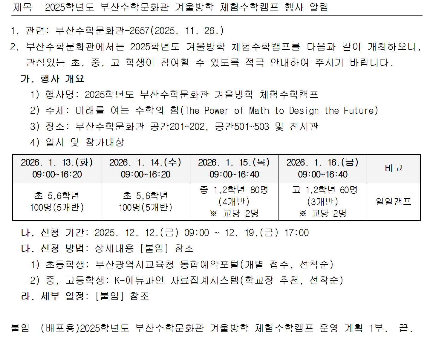 2025학년도 부산수학문화관 겨울방학 체험수학캠프 행사 알림