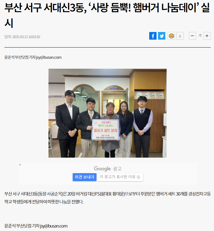 부산 서구 서대신3동, ‘사랑 듬뿍! 햄버거 나눔데이’ 실시 - 부산일보