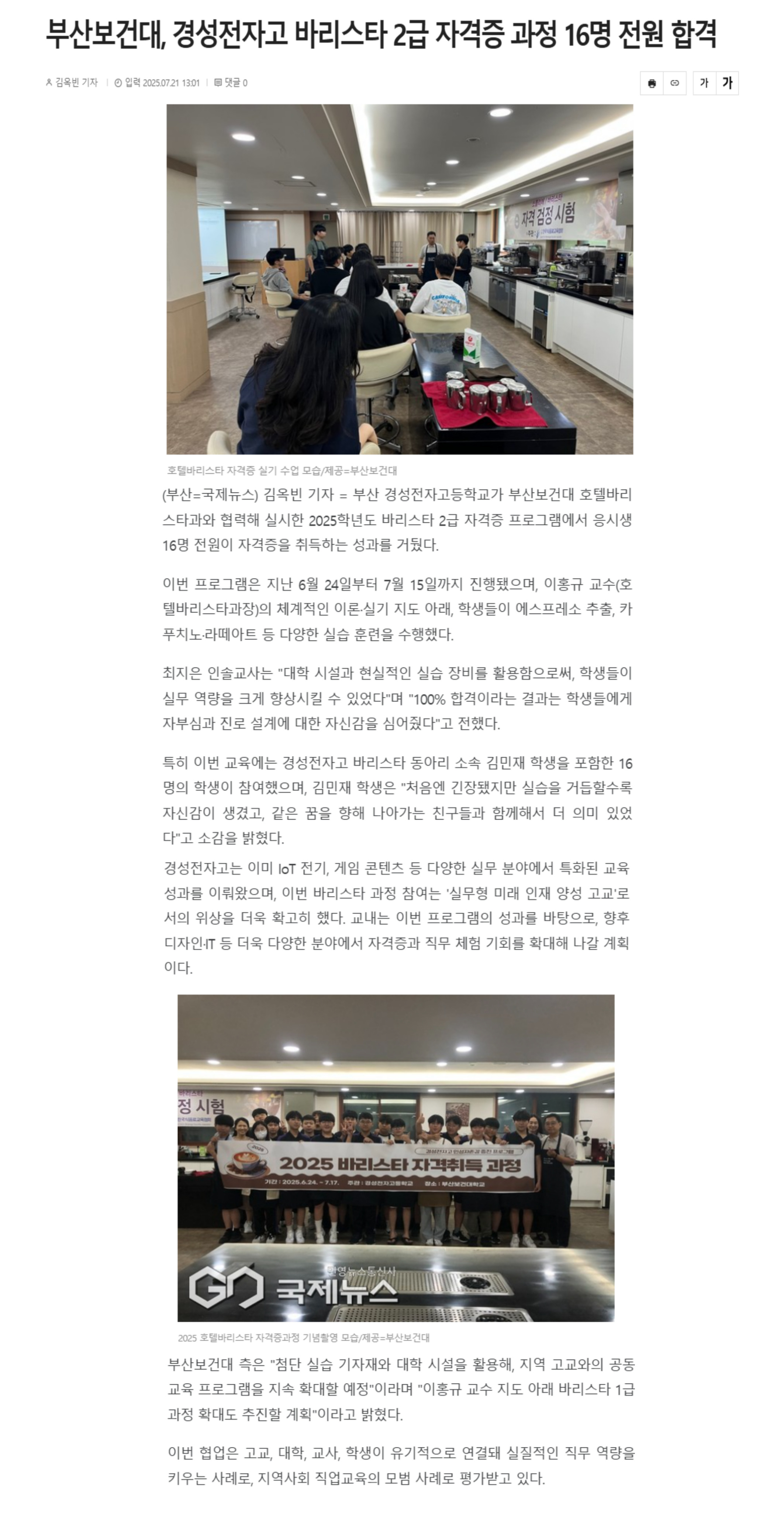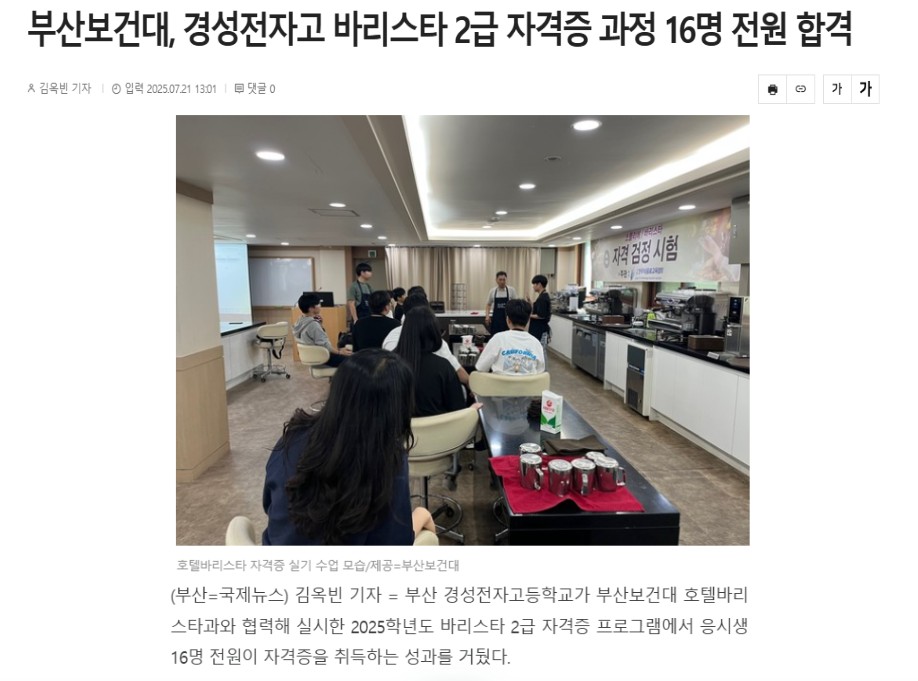 기사 링크 : 부산보건대, 경성전자고 바리스타 2급 자격증 과정 16명 전원 합격 < 부산 < 전국 < 기사본문 - 국제뉴스