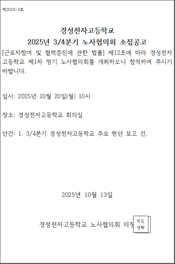 경성전자고등학교 2025년 3/4분기 노사협의회 소집공고
