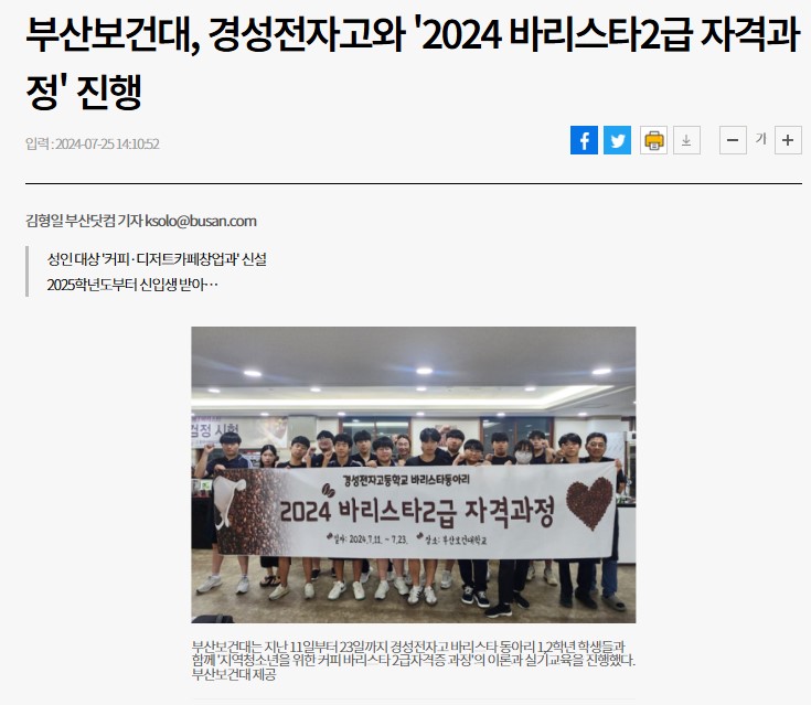 부산보건대, 경성전자고와 `2024 바리스타2급 자격과정` 진행 - 부산일보 (busan.com)