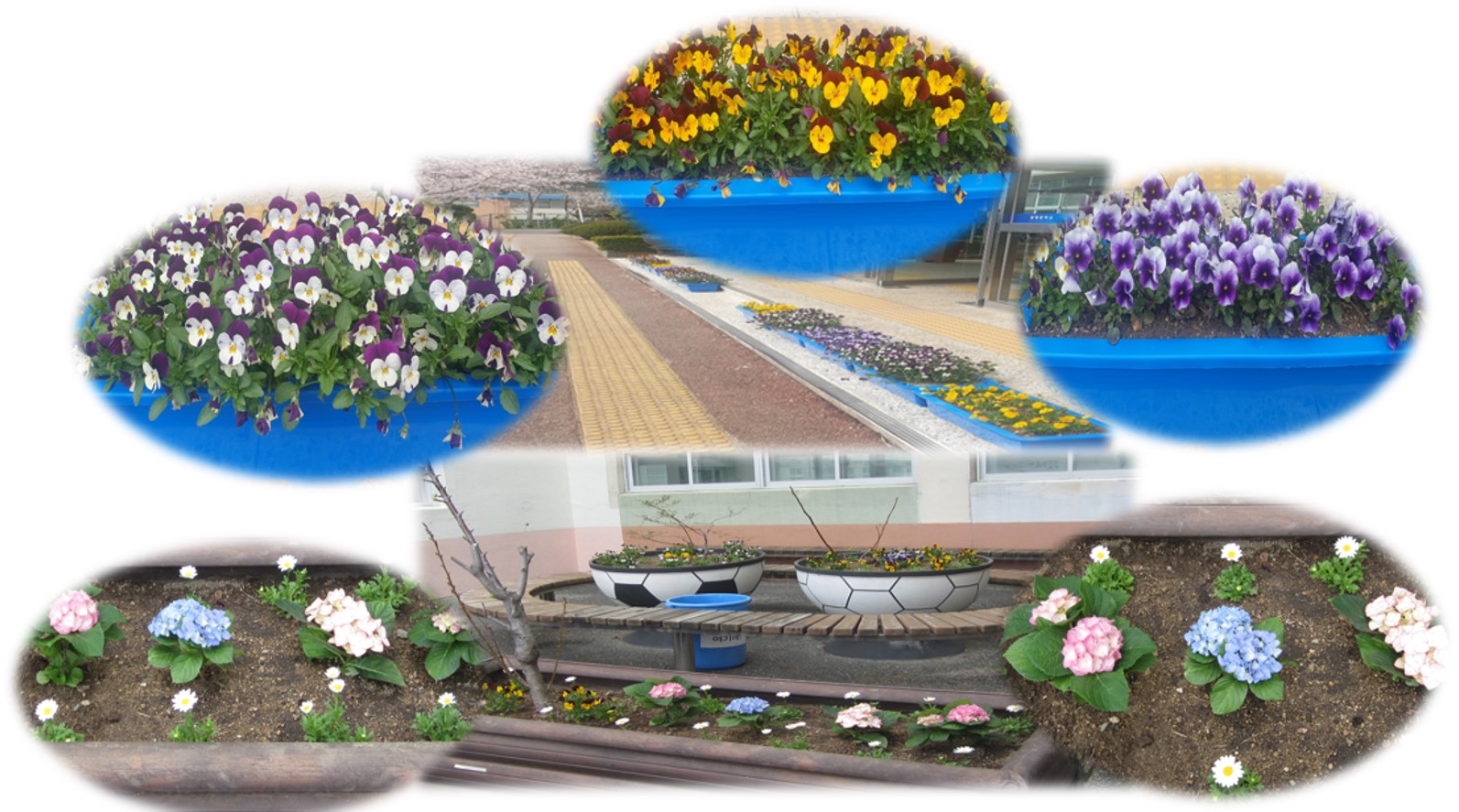 학교 중앙 현관과 뒷마당에 화사하게 핀 예쁜 꽃들이 여러분을 반기고 있습니다.