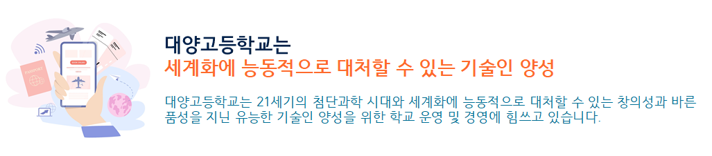 21세기의 첨단과학 시대와 세계화에 능동적으로 대처할 수 있는 창의성과 바른 품성을 지닌 유능한 기술인 양성을 위한 학교 경영에 힘쓰고자 한다.