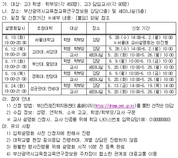 2026대입 서울주요대학 및 부산대 초청 입학설명회 개최 안