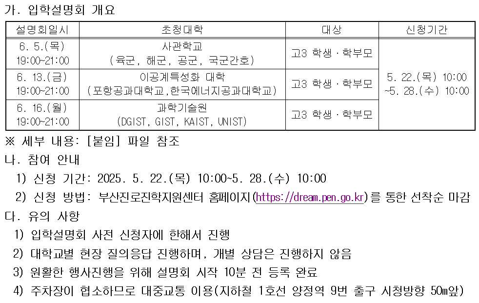 2026대입 특수목적대학(사관학교, 과학기술원) 및 이공계특성화 대학 초청 입학설명회 개최 안내