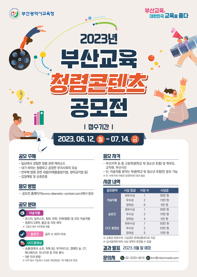 2023년 부산교육 청렴콘텐츠 공모전 공고 부산광역시교육청에서는 청렴에 관한 관심을 다양하게 표현하고, 일상 속 청렴문화 확산을 위해‘2023년 부산교육 청렴콘텐츠 공모전’을 개최하니 학생, 학부모, 교직원 등 부산시민 여러분의 많은 관심과 참여를 바랍니다. 2023. 6. 9. 부산광역시교육감 -------------------------------------------------------------------------------------------------------------------------------------------- 1. 공모전 개요 (공모명) 2023년 부산교육 청렴콘텐츠 공모전 (공모기간) 2023. 6. 12.(월) ∼ 7. 14.(금) (공모분야 및 대상)